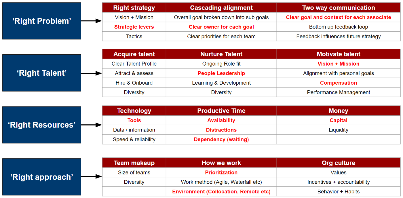 Having the right people in place: Even if we are solving the right problem we need the right talent in the right roles to solve the problem. We can also argue that we need right people to ensure that we are solving the right problem. At a high level this can be broken down into acquiring, nurturing and motivating the right talent.
