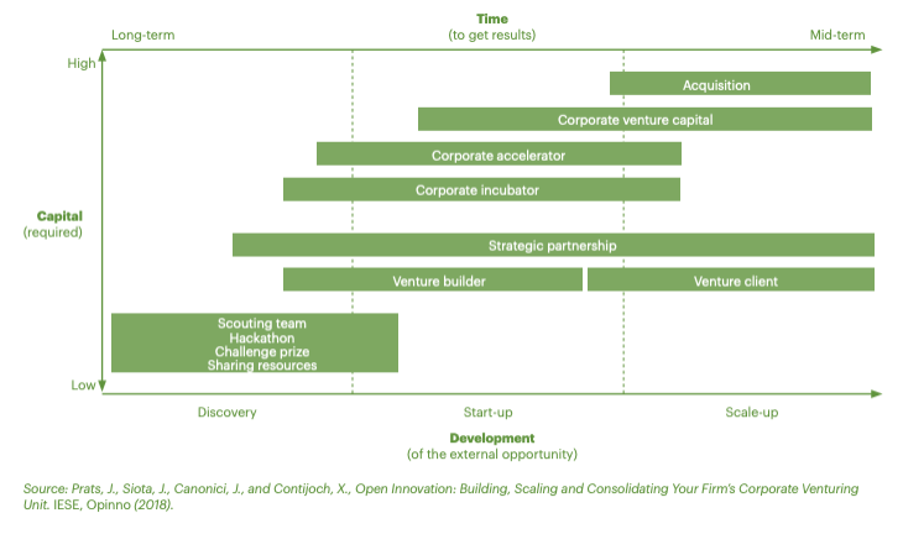 Corporate venturing is used to describe large organisations approaching start-ups to explore innovation opportunities and collaboration. There are many different methods of engagement, which can be organised by 1) size of the start-up, 2) amount of investment required and 3) time to get results: