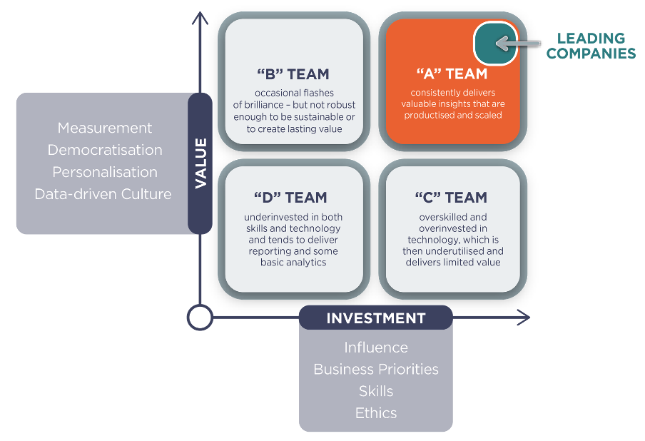 After studying the Leading Companies Model, the question remains for people analytics leaders: “How do I know which ‘state’ my team is in currently, and which actions do I take to deliver more value?” By undertaking the Insight222 Leading Companies Diagnostic, people analytics leaders and chief human resource officers (CHROs) can determine which of the ABCD Teams their team function is currently at, and the steps to take to improve impact.