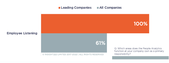 Because of these emerging trends and the evolution towards more advanced data-gathering methods, people analytics has become a valuable tool for employee listening, so much so that our Insight222 research conducted over the last four years has consistently shown that employee listening is one of the areas where people analytics teams add the most value to organisations. It comes as no surprise that the percentage of companies identifying employee listening as a critical area of value within people analytics has steadily increased from 2020 to 2023, reflecting the growing recognition of its importance.